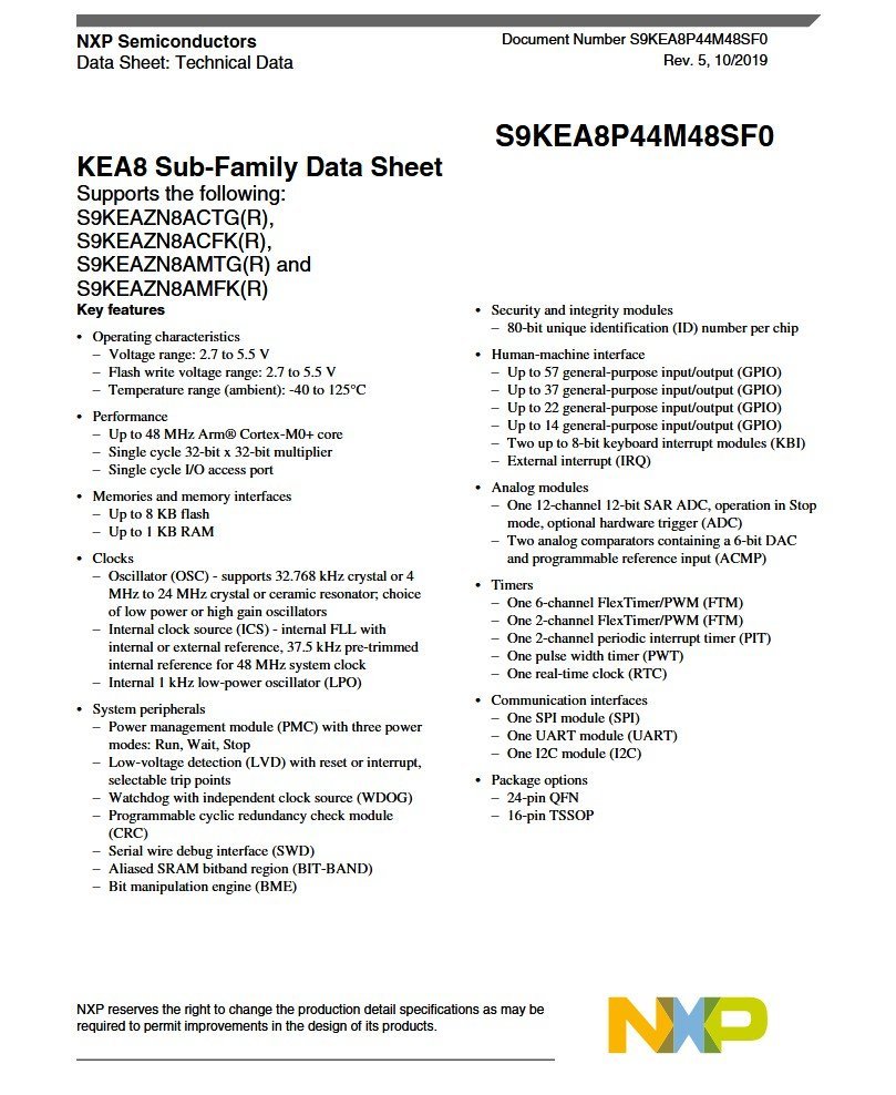 The NXP S9KEAZN8AMFKR is a 32-bit microcontroller from the KEA8 family, built for automotive and industrial applications. It features an ARM Cortex-M0+ core operating at up to 48 MHz. The device includes 64 KB of Flash memory and 4 KB of RAM. It is supplied in a 32-pin QFN package measuring 5mm x 5mm.