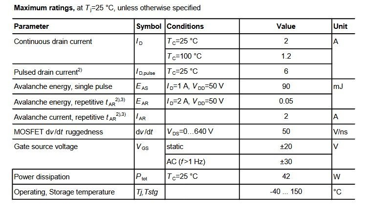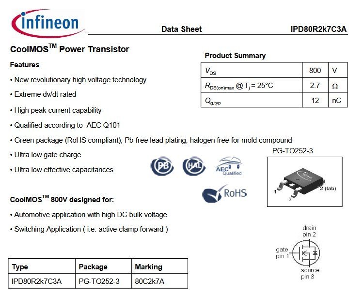 Infineon IPD80R2K7C3A CoolMOS N-channel power MOSFET. This device is optimized for high voltage and high efficiency switching applications. It supports a maximum drain source voltage of 800 V and a continuous drain current of 2.1 A at 25 degrees Celsius. The pulsed drain current capability is up to 6 A. The on resistance is 2.7 ohms at 25 degrees Celsius. The typical total gate charge is 12 nC. Built on CoolMOS technology, it offers extreme dv dt ruggedness, high peak current handling, ultra low gate charge, and very low effective capacitances. It has integrated avalanche energy capability. Qualified to AEC Q101 standards, this MOSFET is ideal for automotive power supplies, active clamp forward converters, LED drivers, and auxiliary power supplies. It operates with a junction temperature range from -40 degrees Celsius to +150 degrees Celsius. Power dissipation is up to 42 W at 25 degrees Celsius case temperature. The device is in a PG TO252 3 DPAK package that is RoHS compliant and halogen free with Pb free lead plating. Manufacturer part number IPD80R2K7C3A.