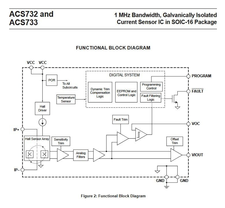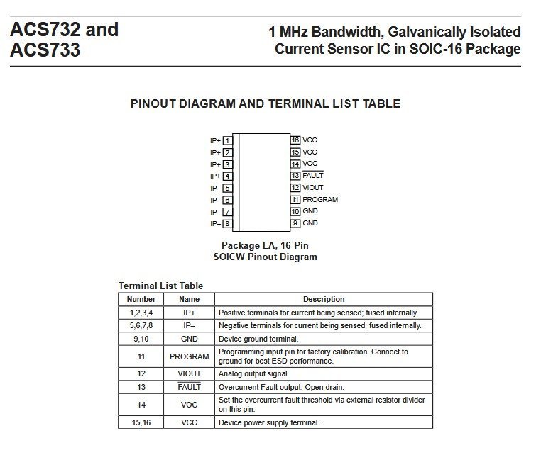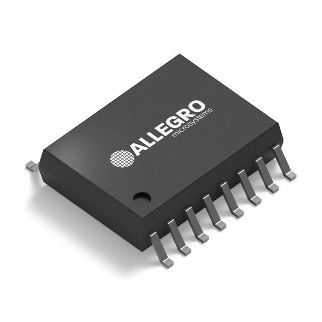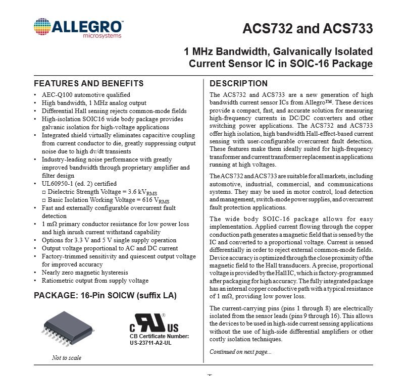 The Allegro ACS733KLATR-40AB-T is a galvanically isolated Hall-effect current sensor for AC and DC current measurement up to plus or minus 40 A. It is housed in a wide-body SOIC-16 package. The sensor provides a 1 MHz bandwidth analog output with differential Hall sensing to reject external common-mode fields. The integrated copper conduction path has a typical resistance of 1 mOhm. The device is factory trimmed for sensitivity and quiescent output voltage. It offers galvanic isolation between the current-carrying pins and the signal pins. The isolation is certified to UL60950-1 with 3.6 kVRMS dielectric strength and a 616 VRMS basic isolation working voltage. It features externally configurable overcurrent fault detection. The analog output is ratiometric and proportional to the supply voltage. The supply voltage is compatible with 3.3 V and 5 V systems. The sensor is AEC-Q100 qualified for automotive applications. Typical uses include DC/DC converters, switch-mode power supplies, motor control, load monitoring, electric vehicle power distribution, battery management, industrial automation, energy metering, and overcurrent protection circuits.