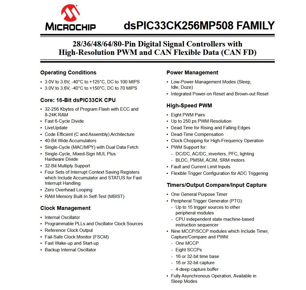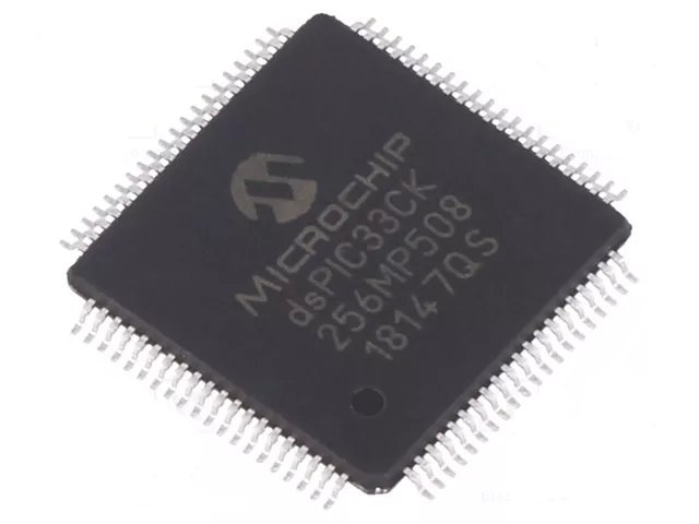 The Microchip dsPIC33CK256MP508T-E/PTVAO is a 16-bit Digital Signal Controller with 256 KB Flash memory. It is packaged in a 100-pin LQFP. This device integrates motor control peripherals and advanced DSP capabilities for real-time control applications.